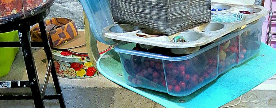 Most of the things in Kathrin’s home are time-worn, and many have been scavenged from familiar places. The proud owner of a dilapidated minivan used mainly for trips out of town, Kathrin likes to navigate her neighbourhood on foot, usually with her two dogs and a kid or two, and always on the lookout for found materials whose lives she can extend through her art. In the well-organized workshop that takes up most of her basement she gathers all kinds of oddments that she can transmute into jewelry, handbags, stationary, wall art, storage boxes…whatever she feels like making today.